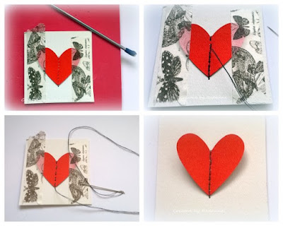 You can stitch by hand onto your project, it will take a little longer but it looks just as effective. On the example below I decided where I wanted my heart, held it in place with washi tape and used a pokey tool on a mat to make the holes. You could stitch direct onto the card but poking the holes through first makes it much easier to control the spacing of the stitches.